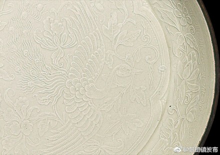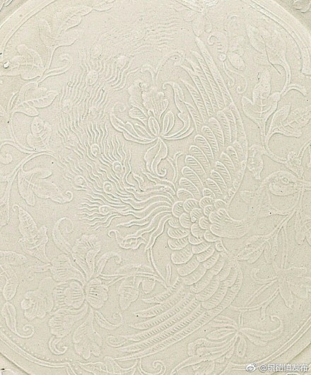 北宋/金 定窯印花盤,臨宇山人舊藏。印花裝飾是定窯白瓷的裝飾技法之一,成熟于北宋中后期,金代更為普及。其做法是將半干的坯體扣在雕刻有圖案的模具上,用手拍打,使花紋印到器物上,然后施釉入窯燒成。整塊模具將紋飾一次拍印完成,操作簡便,易于批量生產(chǎn)。