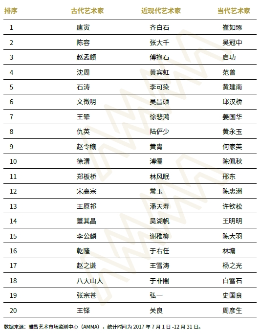 那么,2017年秋拍市場上,中國書畫各個板塊哪些畫家的拍品更受市場追捧?來看看畫家作品入圍各個板塊的TOP20情況:
