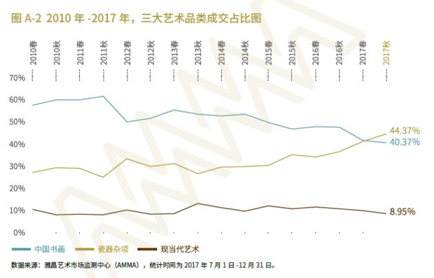所以,從各板塊成交的走勢圖來看,瓷雜板塊拍品在成交上,上升趨勢明顯;而中國書畫板塊的成交占比,已連續(xù)三年下降。