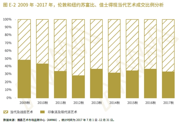 2017年秋拍,西方拍賣市場呈現(xiàn)回暖態(tài)勢,秋季倫敦及紐約的佳士得、蘇富比的印象派及現(xiàn)代派藝術(shù)、當(dāng)代及戰(zhàn)后藝術(shù)市場,表現(xiàn)突飛猛進(jìn),這兩個板塊成交額分別達(dá)8.81億美元、17.6億美元高價,均達(dá)到近九年最高水平。