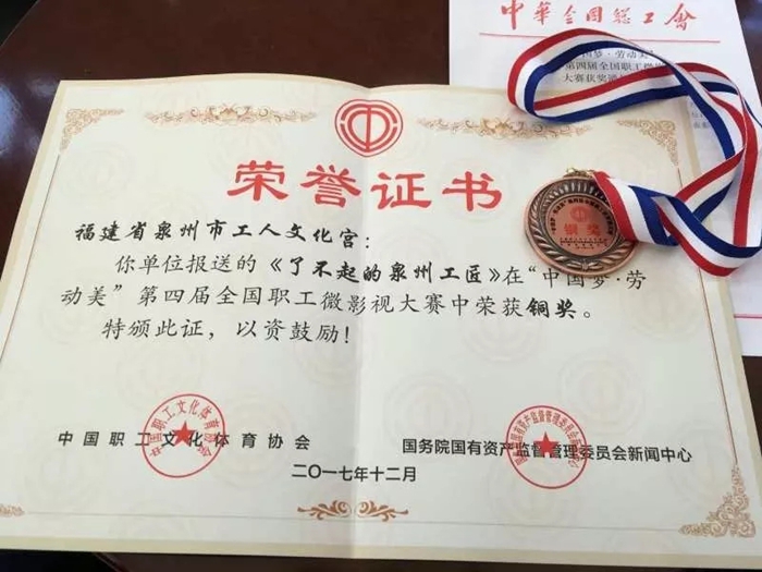 《了不起的泉州工匠》是泉州市總工會(huì)、泉州市工人文化宮和福建泉州金馬傳媒有限責(zé)任公司為首批“泉州工匠”量身打造的系列人物微視頻。日前,《了不起的泉州工匠——賴禮同》榮獲“中國(guó)夢(mèng)·勞動(dòng)美”第四屆全國(guó)職工微影視大賽銅獎(jiǎng)。