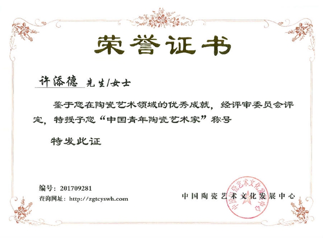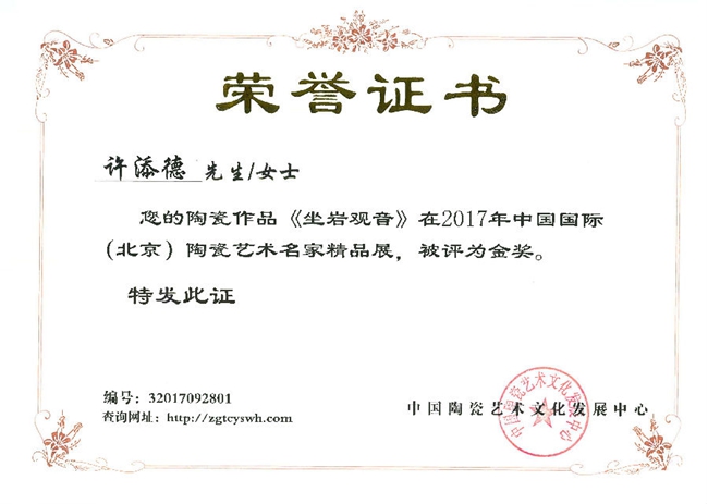 許添德,中國(guó)青年陶瓷藝術(shù)家,工藝美術(shù)師,中級(jí)技師,中國(guó)陶瓷藝術(shù)文化發(fā)展中心會(huì)員,德化縣銘德軒陶瓷有限公司藝術(shù)總監(jiān),1991年出生于出生在有“三大古瓷都”、“中國(guó)瓷都·德化”之稱的福建德化,在瓷都德化瓷藝巨匠群體及千年的傳統(tǒng)陶瓷文化熏陶下,從小就耳濡目染的他對(duì)瓷藝產(chǎn)生了濃厚的興趣 ,也種下了陶瓷之緣的種子。自幼就酷愛陶瓷雕塑,特別對(duì)德化傳統(tǒng)陶瓷佛像有著超乎常人的興趣,這些年來他非常努力地吸收著陶瓷技藝,專研于觀音傳統(tǒng)佛像,探索陶瓷藝術(shù)的真諦,與眾多當(dāng)代德化陶瓷藝術(shù)家學(xué)習(xí)交流,所創(chuàng)作的陶瓷佛像作品,其造型務(wù)實(shí)、 嚴(yán)謹(jǐn)、質(zhì)感強(qiáng)烈、線條優(yōu)美,多次榮獲獎(jiǎng)項(xiàng),深受好評(píng)。