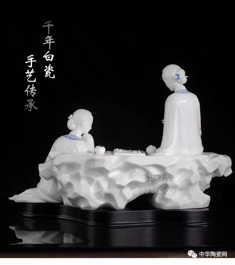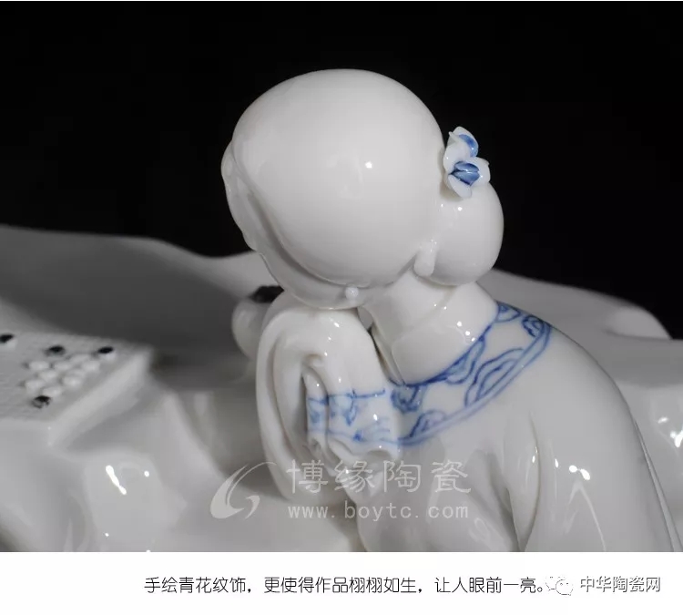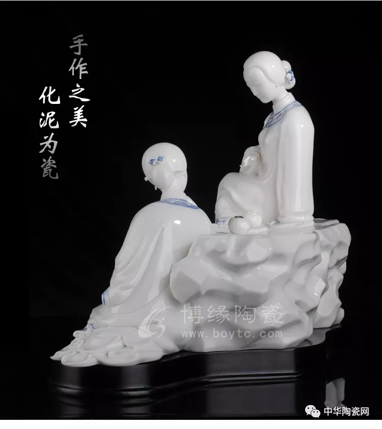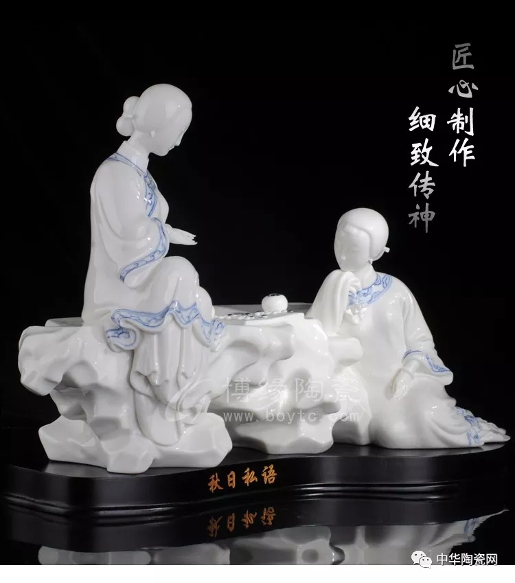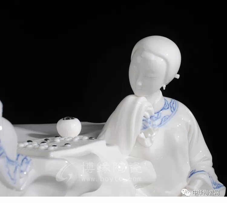 《秋日私語》作品采用德化傳統(tǒng)瓷雕技藝,把人物神態(tài)、衣紋細節(jié)、整體構(gòu)思,描繪的栩栩如生,一個手持棋子將落未落,又一人托住下巴,好似在思索,一動一靜的結(jié)合巧合天工,加之手繪青花紋飾,使得作品更加豐滿。