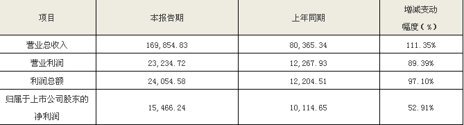 報告期內(nèi),廣東道氏技術(shù)有限公司營業(yè)總收入為169,854.83萬元,和上年同期相比,增長111.35%;公司營業(yè)利潤為23,234.72萬元,和上年同期相比增長89.39%。報告期內(nèi),公司利潤總額為24,054.58萬元,和上年同期相比增長97.10%。