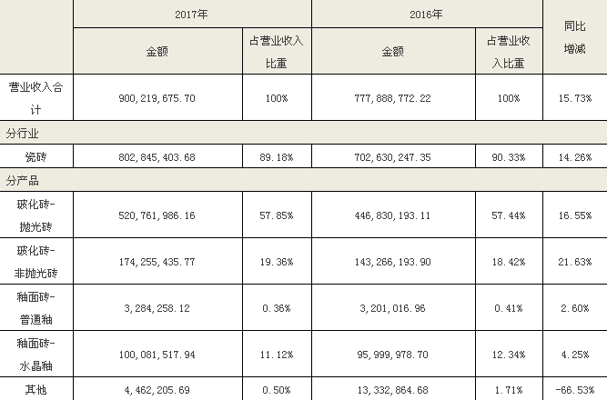 瓷磚業(yè)務(wù)在2017年營業(yè)收入就達(dá)到了8.02億元,同比增長14.26%。因此,瓷磚業(yè)務(wù)就占到營收比重的89.18%,而從產(chǎn)品結(jié)構(gòu)的貢獻(xiàn)占比中,拋光磚所占的營收比重較大,為57.85%。其中醫(yī)療收入同比增加1,346萬元,健康環(huán)境同比增加439萬元。