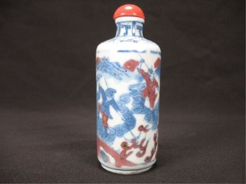 目前所知的瓷胎鼻煙壺中以青花鼻煙壺最為豐富。陶瓷類鼻煙壺在清代產(chǎn)量很大,康熙年間青花鼻煙壺較為多見,單色釉、琺瑯彩鼻煙壺則較少見。雍正、乾隆年間青花鼻煙壺畫工比康熙時(shí)更工整,題材使用廣泛,產(chǎn)量大,青花發(fā)色純正。道光年間青花鼻煙壺雖然產(chǎn)量超過前期,但水準(zhǔn)卻大打折扣。此時(shí)除少量官窯器外,大多產(chǎn)品瓷質(zhì)疏松,畫工也欠嚴(yán)謹(jǐn),款識(shí)多是書寫堂款或是圖記款。光緒至民國(guó)年間所制青花及青花釉里紅鼻煙壺,釉色偏白,畫工多不精,精品如鳳毛鱗角,F(xiàn)代新仿品,底足款識(shí)多以細(xì)筆平描,釉面光亮,畫面上人物、山景、房舍等多先以細(xì)筆勾勒輪廓,再在所勾勒輪廓內(nèi)加繪青花。