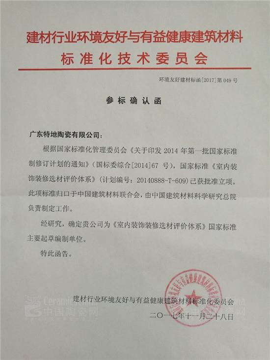 為規(guī)范室內(nèi)裝飾裝修選材標(biāo)準(zhǔn),國標(biāo)委于2014年批準(zhǔn)了由“中國建筑材料科學(xué)研究總院”負(fù)責(zé)制定國家標(biāo)準(zhǔn)的選材體系,在悉知特地•負(fù)離子瓷磚的技術(shù)和健康功效后,經(jīng)過深入溝通論證,2017年11月28日正式批復(fù)直接追加特地為主要起草人單位,作為本項(xiàng)國家標(biāo)準(zhǔn)制定者!參與資格的材料企業(yè)必須是節(jié)能、環(huán)保、綠色健康。特地也是陶瓷行業(yè)唯一一家入選制定標(biāo)準(zhǔn)的企業(yè)!