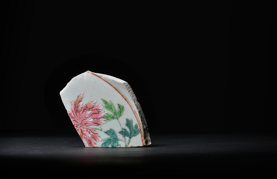 這塊瓷片上有很多值得關(guān)注的細(xì)節(jié):可以明顯看到畫面和色彩受到的磨損,因為所有的顏色都浮在釉的表面,并不受到釉層的保護(hù),青花瓷就沒有這樣的危險;綠色顯得比較薄,而粉紅色花頭的部分則具有一定的厚度;綠色的葉子刻意使用了兩種不同的色調(diào),但每一種綠色只負(fù)責(zé)一片樹葉,而花頭則不同,可以看出粉紅色努力展現(xiàn)的細(xì)微變化,由深至淺或由淺至深,粉紅色最淡的地方,變成了白色;奇怪的是,瓷器本來就是白的,而花頭的白色卻又是堆在瓷器表面的一層,帶有厚度,質(zhì)感上也與瓷器的白色很不同。
