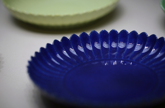 在瓷器史上,單色釉菊瓣盤這樣的作品看上去雖然漂亮但似乎太過直白,如果說有很多令人玩味的細(xì)節(jié),則難以想象:既沒有繪畫可以讓畫工展現(xiàn)一只鳥的眼眉,又沒有雕刻可以讓人在米粒大小房間里看到站立的書生,就是干干凈凈的一組盤子,只是顏色各不相同。如果說與普通的盤子相比有什么區(qū)別,那就是盤子的外沿是模仿菊花的花瓣,而盤子看起來便像是一朵朵色彩各異的菊花。