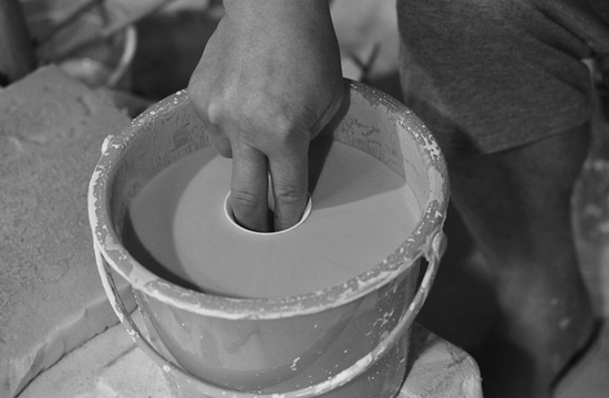 施釉的主要方法有澆釉、吹釉和蘸釉等。在整個陶瓷史上,除了澆釉后來很少使用,其他的方法基本上一直使用,之所以有這么多不同的方法,是因為不同釉的狀態(tài)不同,瓷器的器形也千變?nèi)f化,某種釉用在瓶子上可以用蘸釉的方法,但用在小杯子上就可能是吹釉。反之,同一個器形上,不同的釉也需要不同的施釉方法。這一套十二種顏色的盤子,就分別使用了多種施釉的方法。比如灑藍(lán)是吹釉,胭脂紅就是拍釉,而黃色可能是涂釉。但不管哪一種方法,要保持釉面的絕對均勻都是不小的挑戰(zhàn)。比如涂釉,一筆與一筆之間必然有交搭,而蘸釉,盤子從釉里面取出,釉會流淌,越往下釉自然就越厚。凡此種種。