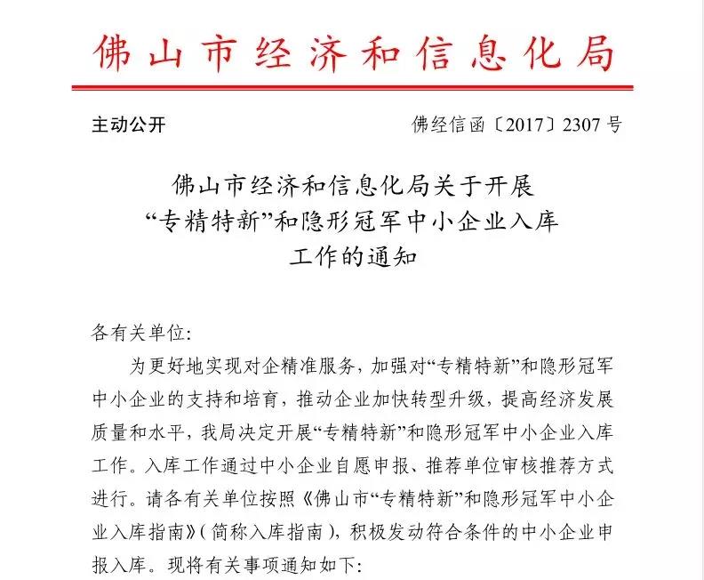 根據(jù)《佛山市經(jīng)濟(jì)和信息化局關(guān)于開展組織佛山市“專 精特新”和隱形冠軍中小企業(yè)入庫的通知》(佛經(jīng)信函〔2017〕2307號)要求,申請企業(yè)必須是入庫范圍內(nèi)企業(yè),符合通用條件外,還須符合專業(yè)化、精細(xì)化、特色化、新穎化、隱形冠軍五項(xiàng)專項(xiàng)條件一項(xiàng)或以上。