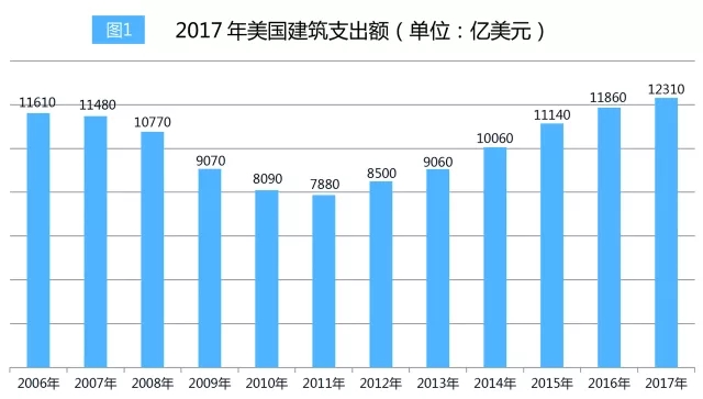 在建筑業(yè)方面,美國(guó)2017年建筑支出(包括私有和公有的建筑以及非住宅建筑)創(chuàng)歷史新高,達(dá)1.231萬億美元,較2016年增長(zhǎng)了3.8%,實(shí)現(xiàn)連續(xù)六年的增長(zhǎng)。