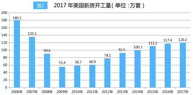 在房地產(chǎn)方面,美國(guó)2017年新房開工數(shù)量創(chuàng)下十年來的最高記錄,達(dá)120萬套,較2016年增長(zhǎng)了2.4%,實(shí)現(xiàn)連續(xù)八年的增長(zhǎng)見。