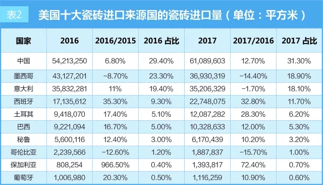 2017年,中國(guó)再次成為美國(guó)第一大進(jìn)口瓷磚來源國(guó)。事實(shí)上,從2015年起,中國(guó)就替代墨西哥成為對(duì)美出口瓷磚量最多的國(guó)家。2017年中國(guó)對(duì)美國(guó)出口的瓷磚量從2016年的5400萬平方米增長(zhǎng)到6100萬平方米。增長(zhǎng)了12.7%,占美國(guó)進(jìn)口瓷磚總量的31.3%,高于2016年的29.4%。