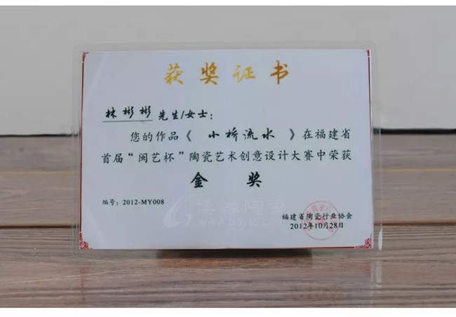 作品還榮獲福建省首屆“閩藝杯”陶瓷藝術(shù)創(chuàng)意設(shè)計(jì)大賽金獎(jiǎng)。