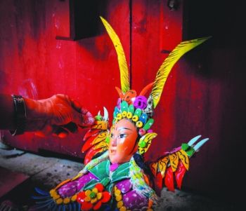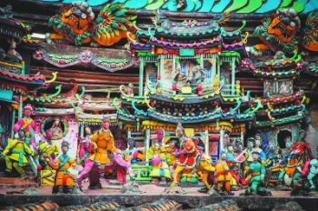 “三座大殿屋頂上,近300個(gè)戲曲人物錯(cuò)落分布,神態(tài)各異,它們都來(lái)自潮劇楊家將、薛丁山故事中的人物形象。此外,還有各種閣樓亭榭、花草樹(shù)木、飛禽走獸作為背景。”沈振澤說(shuō),詔安武廟屋頂上的剪瓷雕大手筆,正出自沈氏藝圃。1990年武廟翻修時(shí),沈氏兄弟耗費(fèi)近半年時(shí)間,才完成了剪瓷雕部分的創(chuàng)作,數(shù)萬(wàn)只彩色瓷碗由此化作屋頂上凝固的風(fēng)景。如今縣城的地標(biāo)性建筑文昌宮、城隍廟等,同樣是沈氏家族的代表作。