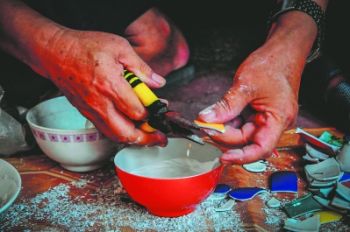 “剪瓷片是一個(gè)充滿(mǎn)變數(shù)的過(guò)程。”沈振澤表示,工匠首先利用木槌將瓷碗隨機(jī)敲打成片,這一過(guò)程全憑感覺(jué),并不刻意追求瓷片形態(tài),技藝純熟的工匠無(wú)論瓷片大小,總能物盡其用,“而后運(yùn)用特制的平口老虎鉗剪切瓷片時(shí),需要根據(jù)不同的材質(zhì)因材施藝,恰如其分地掌握好個(gè)中力度。不少初學(xué)者常常掌握不好分寸,被夾得呱呱叫”。