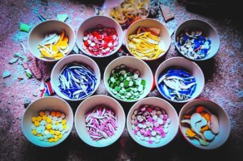 剪瓷片是核心環(huán)節(jié)。閩南地區(qū)早年興盛的陶瓷業(yè),為剪瓷雕提供了充足的原材料。“坯薄質(zhì)脆的彩色瓷片不僅視覺(jué)上絢麗,更經(jīng)得住風(fēng)雨、海堿的侵蝕。”沈振澤表示,早期剪瓷雕利用的大多是破碎瓷器,而今各地瓷廠則專(zhuān)門(mén)燒制應(yīng)用于剪瓷雕的瓷碗。