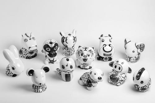 在郭超所做的這套十二生肖陶瓷中,他將這二者進(jìn)行了完美結(jié)合,以公仔元素為切入點(diǎn),將傳統(tǒng)的纏枝紋作為衣飾紋樣,以青花料描繪在動(dòng)物瓷雕上,再配以代表富貴吉祥的牡丹花。十二個(gè)小動(dòng)物全都穿上了頗具“中國(guó)風(fēng)”的衣服,看起來(lái)別有一番韻味。
