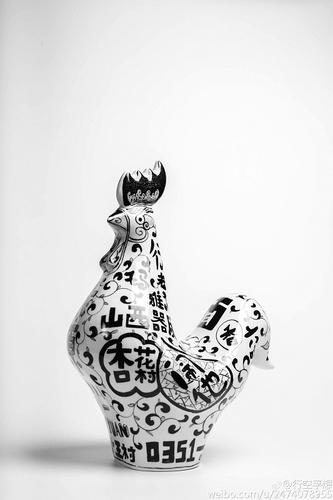 去年,郭超做了一款陶瓷雞,除了青花和纏枝紋,其它所有元素都和山西相關(guān),比如,他加入了一些山西的品牌符號(hào)“六味齋”“杏花村”“王萍面皮”“FM107”等,還加入了“鬧他”等山西俚語(yǔ)。之所以想做這樣一款陶瓷雞,一是為了好玩,二是因?yàn)楣巧轿魅,想做一只形式比較新穎的“山西雞”。同年,山西省第三屆文博會(huì)在太原舉辦,郭超還帶著他的“山西雞”去參加展覽,前來(lái)參觀的人都表示這只雞很有意思,“一看就是山西的雞,身上有那么多山西元素”。