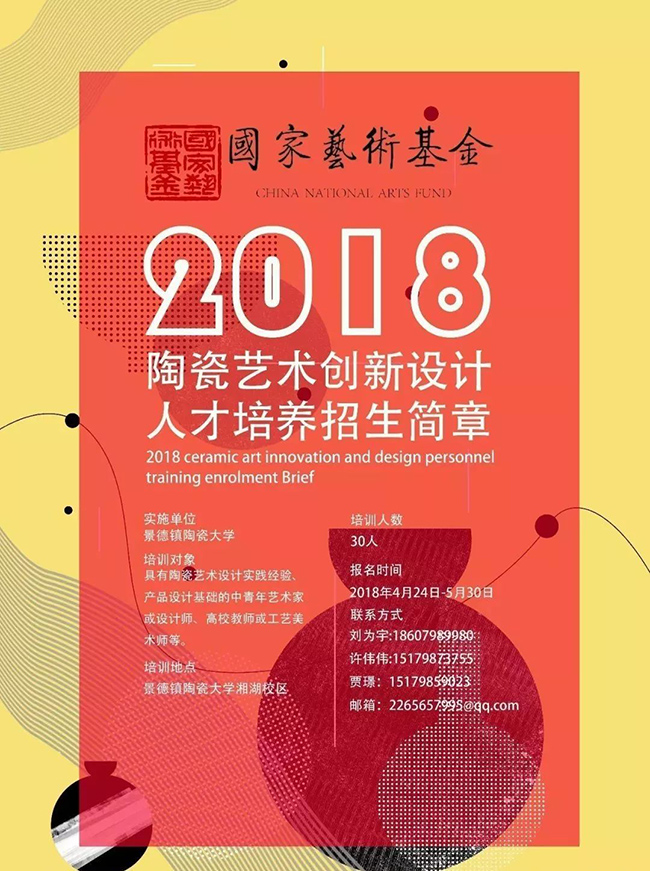 響應(yīng)國家“一帶一路”發(fā)展戰(zhàn)略,深入貫徹黨的十九大精神,增強文化自覺和文化自信,推動社會主義文化繁榮興盛,提升我國陶瓷藝術(shù)創(chuàng)新設(shè)計的品質(zhì)和影響力,以景德鎮(zhèn)陶瓷大學(xué)為主體舉辦的國家藝術(shù)基金2018年度藝術(shù)人才培養(yǎng)資助項目《陶瓷藝術(shù)創(chuàng)新設(shè)計人才培養(yǎng)》,現(xiàn)面向全國公開招收學(xué)員。