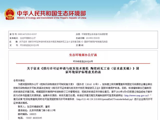 5月8日,生態(tài)環(huán)保部官網(wǎng)發(fā)布公函稱:為加快建立和完善覆蓋所有固定污染源的企事業(yè)單位控制污染物排放許可制,決定制定《排污許可證申請與核發(fā)技術規(guī)范 陶瓷磚瓦工業(yè)》國家環(huán)境保護標準,并發(fā)布標準《征求意見稿》。