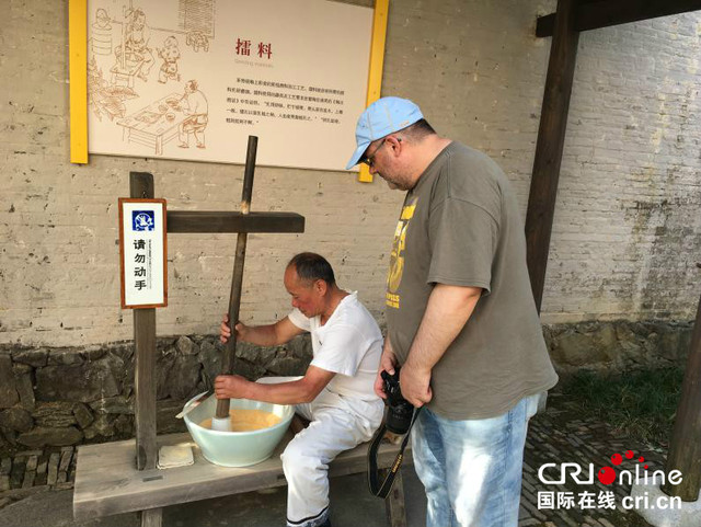 匈牙利記者拉斯洛在景德鎮(zhèn)陶瓷民俗博物館觀看陶瓷制作擂料工序。攝影 趙征宇