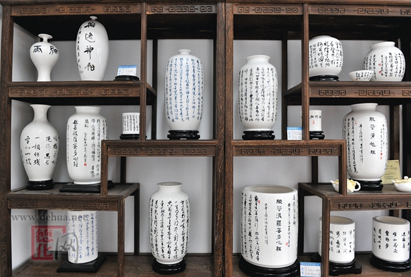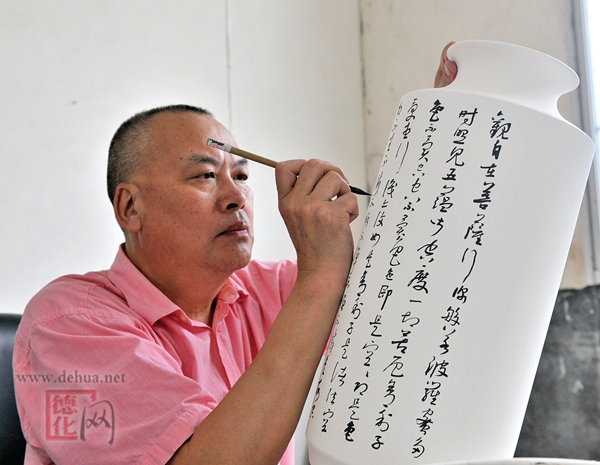 德化白瓷通透純潔,猶如羊脂美玉,是極好的表現載體。張金水把書法和傳統陶瓷技藝結合,素胚勾勒,筆走龍蛇,他的瓷字時而溫和典雅、時而雄強奇崛、時而自然散逸、時而高古曠達,筆盡意未盡,細品之下良多趣味。不斷探索書法藝術風格、努力嘗試各種陶瓷器型,進一步提高德化陶瓷的藝術價值,這便是張金水一直以來的夢想。