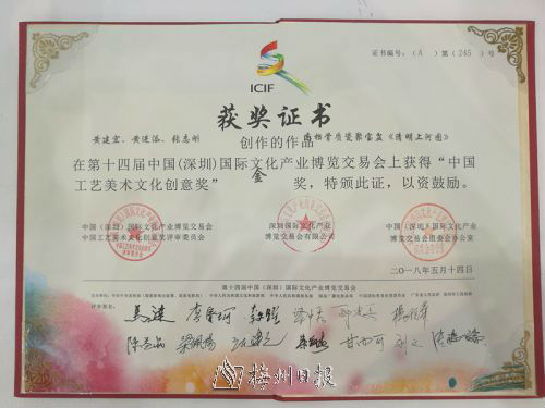 記者昨日從深圳文博會(huì)組委會(huì)了解到,由廣東大埔縣怡豐園公司選送的青花骨質(zhì)瓷“聚寶盆”《清明上河圖》,在第十四屆深圳文博會(huì)上獲得“中國(guó)工藝美術(shù)文化創(chuàng)意獎(jiǎng)”金獎(jiǎng)。