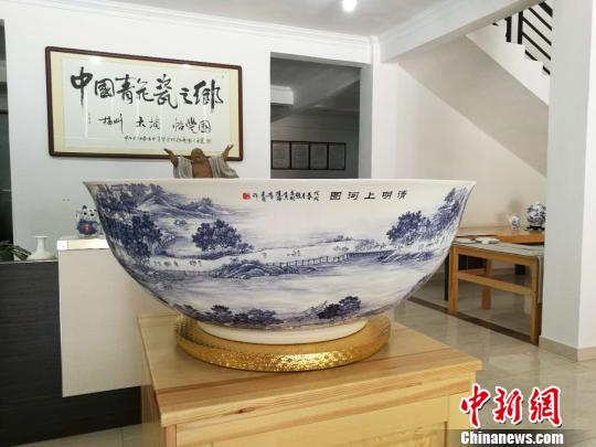 獲得第十四屆文博會(huì)“中國(guó)工藝美術(shù)文化創(chuàng)意獎(jiǎng)”金獎(jiǎng)的中國(guó)最大青花骨質(zhì)瓷“聚寶盆”