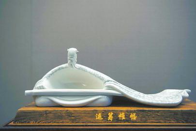 記者在展廳看到,相比傳統(tǒng)的佛教造像,用現(xiàn)代學(xué)院派手法制作的瓷雕,顯然更受年輕人喜愛。陶瓷藝術(shù)大師蘇獻(xiàn)忠的《進(jìn)出》仕女系列白瓷工藝品,既有傳統(tǒng)德化白瓷的溫潤質(zhì)地,又有現(xiàn)代雕塑洗練的線條和審美;另一件創(chuàng)新白瓷《運(yùn)籌帷幄》造型夸張,正在彈琴的諸葛亮身體鑿空,寓意“空城計(jì)”,設(shè)計(jì)手法十分高妙。