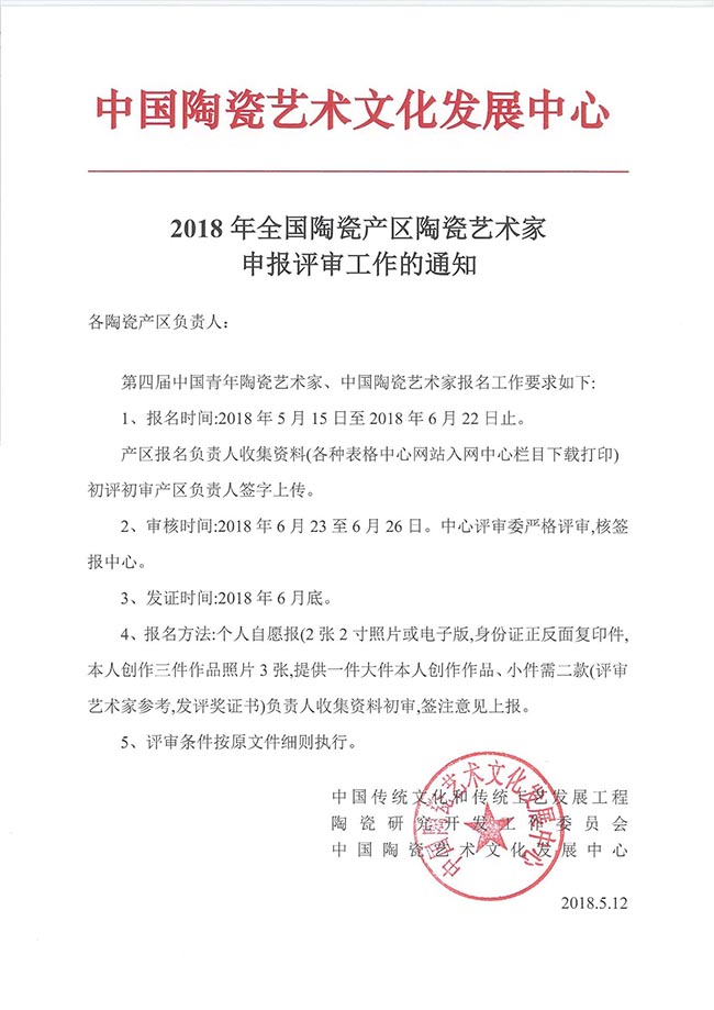 2018年全國陶瓷產(chǎn)區(qū)陶瓷藝術(shù)家申報評審工作的通知