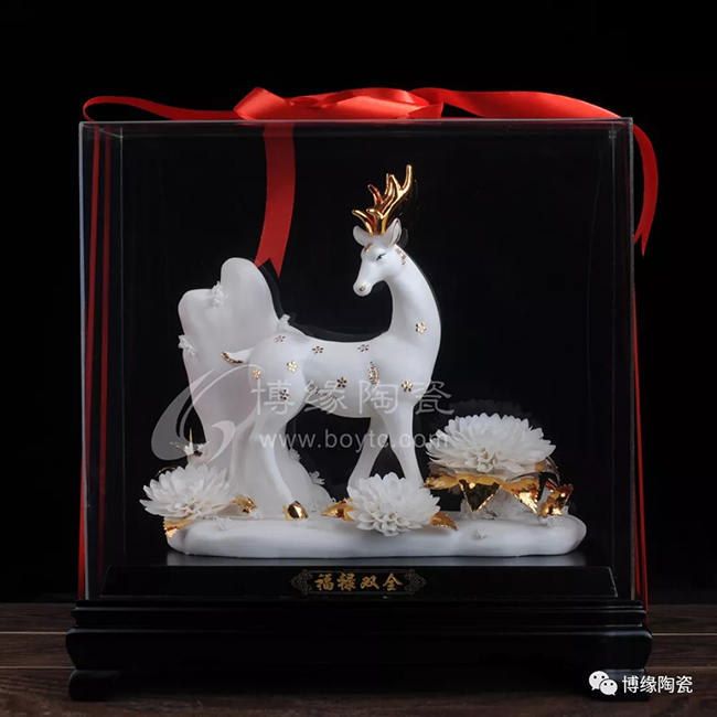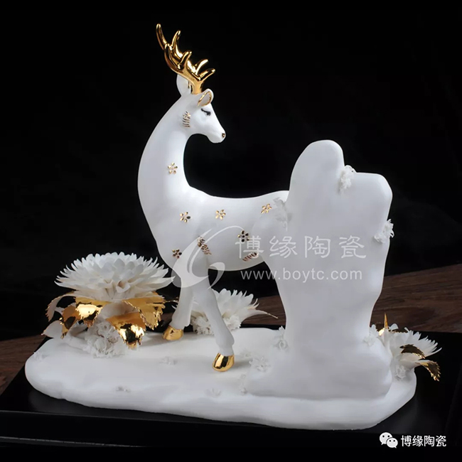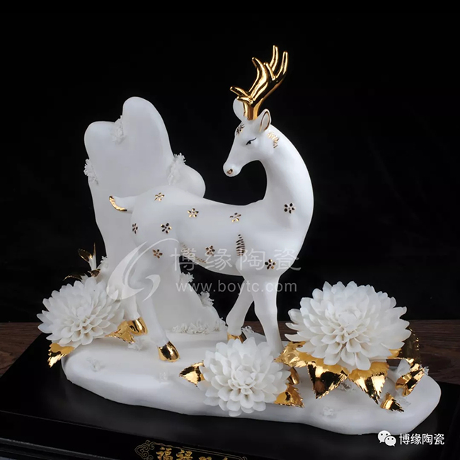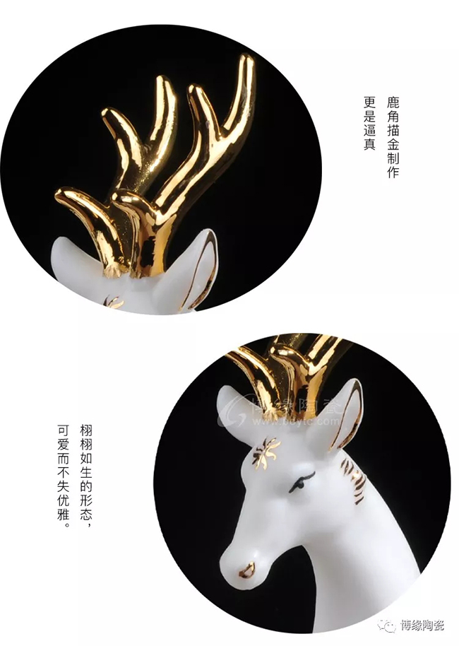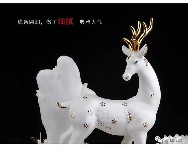 該作品純手工打造,所塑鹿神態(tài)逼真,造型優(yōu)美,以描金工藝體現(xiàn)作品高貴,以手工瓷花作為配飾,使作品更精細(xì),富有現(xiàn)代家居美感,透露出時(shí)尚簡約的氣質(zhì),是送禮禮品和家居擺件的極佳選擇。