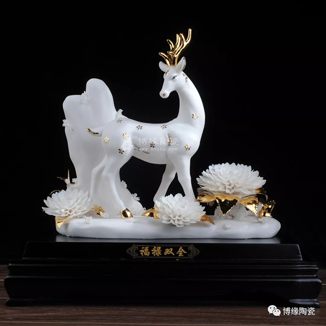 該作品“福祿雙全”為雕塑小鹿與純手工瓷花相結(jié)合,造型獨(dú)特新穎;福意為福氣,“鹿”與“祿”同音,象征吉祥長壽和升官之意,傳說千年為蒼鹿,兩千年為玄鹿,故鹿乃長壽之仙獸,自古就備受眾人喜愛。