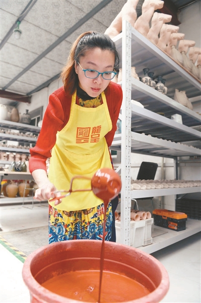 說自己的經(jīng)歷,孫天舒很動(dòng)情感:“很多人說我選擇了一條最難的路,的確與泥料為伴的日日夜夜中,我經(jīng)歷了常人難以忍受的苦。”經(jīng)過一番努力,孫天舒在關(guān)濤教授指導(dǎo)下,根據(jù)遼瓷斷代前的造型工藝,恢復(fù)出制瓷工藝的流程,包括練泥、拉坯、印坯、利坯、曬坯、刻、劃、剔、素?zé)、點(diǎn)彩、施釉、釉燒等。在造型方面,依據(jù)契丹族遼瓷的獨(dú)有器型,進(jìn)行1:1等比例恢復(fù),包括鳳首瓶、皮囊壺、寶葫蘆、交頸鴛鴦壺、雞腿壇、摩羯壺、魚形壺、馬蹬壺等。“做一批作品需要三四個(gè)月,幸運(yùn)的話能出一件成品,有時(shí)候幾百件里出一件,可謂‘百里挑一’。”