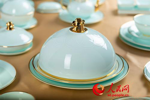 不僅如此,所有的器皿需要經(jīng)過(guò)原料精選、煉泥、成型 、精修坯、素?zé)、拋光、施釉、釉燒、描金、彩烤?0余道精細(xì)的工序,以此打造國(guó)瓷的最高品質(zhì)。“此次呈獻(xiàn)給上合青島峰會(huì)各國(guó)元首的華青瓷‘千峰翠色’ 彰顯了當(dāng)代制瓷科技新高度。”蘇同強(qiáng)說(shuō)。