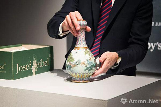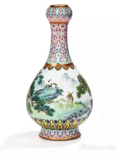 本瓶極其珍罕,屬于孤例,制于乾隆景德鎮(zhèn)御窯。該時期之洋彩瓷器極鮮見于市場,大部份藏于臺北國立故宮博物院及世界各地其它博物館。如此珍品現(xiàn)身拍場,必見藏家爭相追捧:今年四月,香港蘇富比上拍一件粉紅地琺瑯彩盌,以2.39億港元(約2,170萬英鎊)成交。