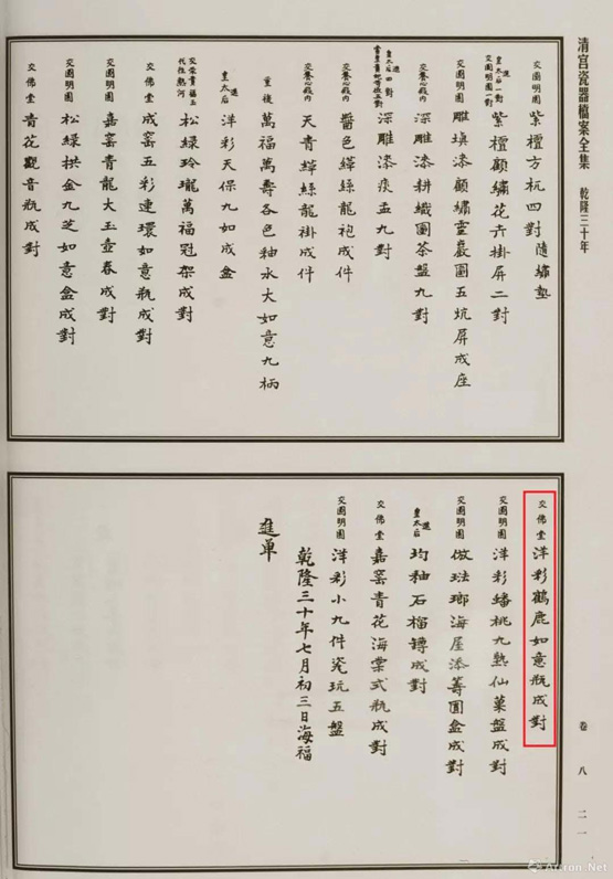 據(jù)《清宮瓷器檔案全集》記載,僅兩例洋彩鶴鹿圖如意瓶。乾隆三十年,太監(jiān)海福送一對此等瓶往佛堂。乾隆三十四年,命御窯制兩瓶為賀壽禮品 。