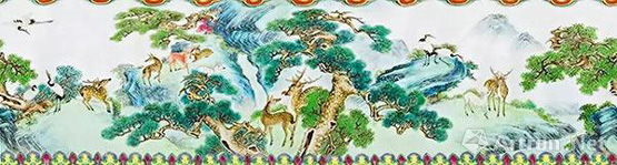 此瓶瓶身繪鹿鶴壽松,寓意福壽康寧:九只祥鹿及五只丹頂白鶴,置嶙峋奇石,古松競奇,遠處山峰煙霧彌漫,畫師卓藝可見。紋飾相近之瓶,僅見一例,現(xiàn)收錄于巴黎吉美博物館,較此瓶之器形紋飾,雖有異曲同工之妙,但裝飾手法相異。清朝年間,御花園苑飼養(yǎng)鶴鹿,供皇帝玩賞,而本瓶所繪風景,極有可能為乾隆御花園實景寫照。鹿,通祿,為壽星坐騎,而鶴則代表長壽,仙人多乘鶴。靈芝珍稀,只長于仙島。