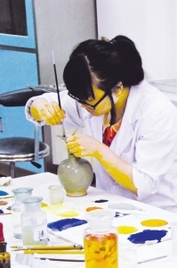 陶瓷修復(fù)工作不僅講究細(xì)心、耐心,更講究對(duì)美學(xué)的認(rèn)知,對(duì)色彩的掌握,因此,曹元元認(rèn)為,“上色”算得上是過程里最難的一個(gè)步驟,“瓷器外面有一層玻璃質(zhì)感的物質(zhì),釉面大概這么厚,我們上色首先要把器物填平,平了之后底下的這層顏色,先把它上出來,最后一點(diǎn)點(diǎn)上玻璃質(zhì)感這一層。每一層都非常薄,厚度是一層一層堆積出來的。中間如果你有一筆出錯(cuò)的話,就要把之前全都洗掉再重新來”,在她看來,文物修復(fù)除了專業(yè)知識(shí),美學(xué)的功底更是必不可少,正是因?yàn)殚L期畫畫的緣故,曹元元對(duì)顏色極其敏感,上色的技巧也是頗有心得。