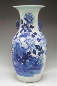 光緒青花雉雞牡丹紋瓶修復(fù)前的樣子。