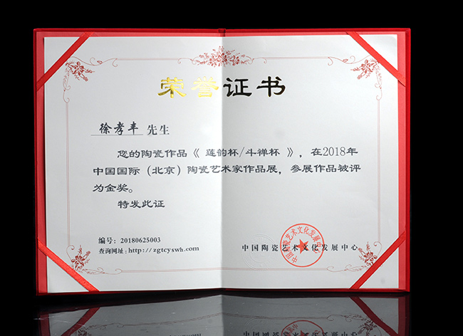作品《蓮韻杯/斗禪杯》在中國(guó)北京陶瓷藝術(shù)作品展中被評(píng)為金獎(jiǎng)
