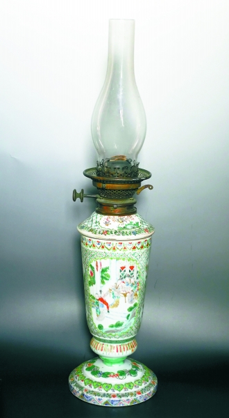 “外銷瓷是征服世界的藝術外交瓷,促進了中西方經濟、科技、藝術的進步和交融。”在收藏的外銷瓷中,關海森特別偏愛一種特殊的品類——定制器。他認為,定制瓷是東方工藝與西方文明的激烈碰撞,在碰撞中互相學習、融合、共生。多年運用高科技光學儀器從事古玩鑒定的工作,讓關海森對“燈”有著特殊的感情。在他收藏的陶瓷燈具中,有一盞清代的五彩陶瓷油燈較為特殊,屬于典型的定制外銷瓷器。設計者充分利用陶瓷、金屬、玻璃等不同材料的特性,把東方的陶瓷之美與西方的機械工藝巧妙地結合。油燈高60厘米,由燈座、油倉、燈盤、燈罩四部分組成。燈座用陶瓷做成獎杯的形狀,厚重高大的陶瓷燈座穩(wěn)固、安全。燈座的杯口內安插一只以斜肩為沿的短柱形陶瓷油倉,口部鑲嵌銅箍,用來儲存燃油。