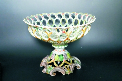“自古以來玲瓏瓷、脫胎瓷是陶瓷燒制工藝中難度最大的,常見的玲瓏瓷器在制作時往往‘肉’大于‘漏’,也就是挖掉的鏤空部位要比留下的坯體體積小。而這對果盤恰恰相反,而是‘漏’大于‘肉’。”關海森說,這對玲瓏瓷果盤非常罕見,不但工藝精美細致,設計也非常大膽,是西方美學觀念與東方審美情趣巧妙的交融。