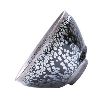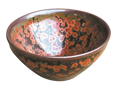 但蔡炳盛并未滿足。宋代建窯分兔毫盞、油滴盞、曜變盞以及柿紅、灰皮、烏金等雜色釉,珍貴程度由高到低依次為曜變、油滴、兔毫。燒制出了兔毫盞,雄心勃勃的蔡炳盛又向著油滴盞進發(fā)了。這一目標的達成,更非試燒兔毫盞可比擬——直到八年后的1990年,經(jīng)過不懈的努力,通過對坯、釉原料的收縮比例、施釉的厚薄程度、燒窯時一氧化碳的濃淡和燒成溫度等的嚴格分析和把控,蔡炳盛終于成功燒制出油滴盞。“兔毫釉是在氧化氣氛中實現(xiàn)的,而油滴盞需要還原氣氛,成敗在于最后燒爐的幾分鐘,因此難度非常高。”