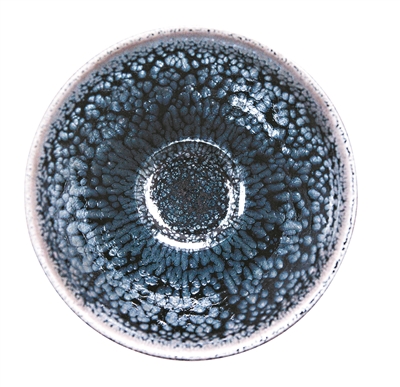 如今,幾十年過去了,蔡炳盛不斷鉆研建盞各類品質(zhì)的燒制,配出了各種釉水配方,老窯的各種花色燒制技術(shù)已全部復現(xiàn)。尤其是他制作的銀藍油滴盞,泛發(fā)著幽藍的光澤,油滴滴點實而不虛,晶體厚重,古韻十足,備受人們的歡迎。除了傳承宋盞經(jīng)典款式之外,蔡炳盛還創(chuàng)新釉料,開發(fā)出類似耀斑形狀的鐵紅色斑紋作品“火鳳凰”。“‘火鳳凰’需要做到對溫度的精確把控,多一度釉面會燒黃,少一度則滴不成滴。”