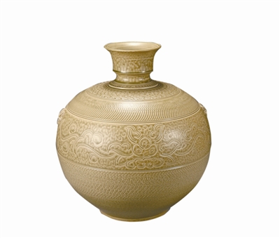 造型古樸是婺州窯的原始屬性,能給人一種樸素天然的感覺。它要求造型、釉色、裝飾三點要素必須和諧統(tǒng)一。“最古老的青瓷就是草木灰當釉料的,而且代代相傳。”他說,“灰釉雖不如白瓷青瓷那么光鮮,但色澤沉穩(wěn),只要掌握火候還能生出包漿,這是其他釉色所不能具備的。”根據(jù)殘存的資料,經(jīng)過多年的實踐研究,確立草木灰釉的基調(diào)后,陳新華運用跳刀、刻花、貼鋪首、堆塑成形等技法,整理開發(fā)了上百款婺窯器形,件件特色鮮明。