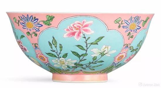 清康熙 御制粉紅地琺瑯彩開光花卉碗 直徑14.7cm