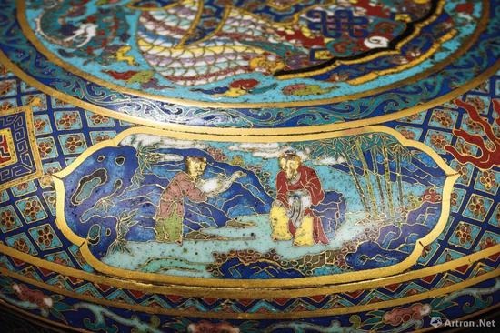 用源自歐洲的華麗多彩的琺瑯彩料,表現(xiàn)中國(guó)傳統(tǒng)的文人故事,體現(xiàn)了十八世紀(jì)清代宮廷所喜愛的視覺藝術(shù)形式。這類藝術(shù)作品是中西文化融合后的產(chǎn)物,是那個(gè)時(shí)代特有的藝術(shù)成就