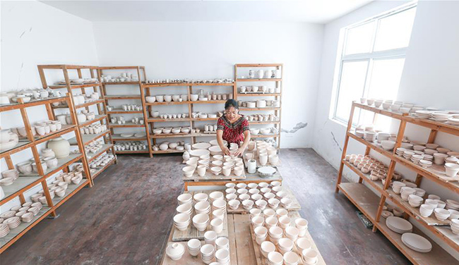 團(tuán)隊(duì)成員洪秋女在擺放瓷坯。